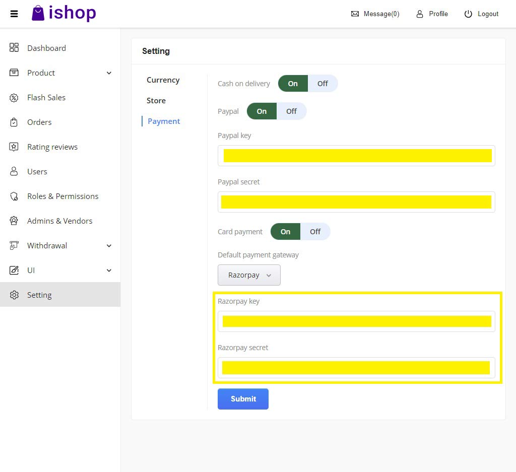 - Choose Razorpay and put the razorpay publishable key and secret key.