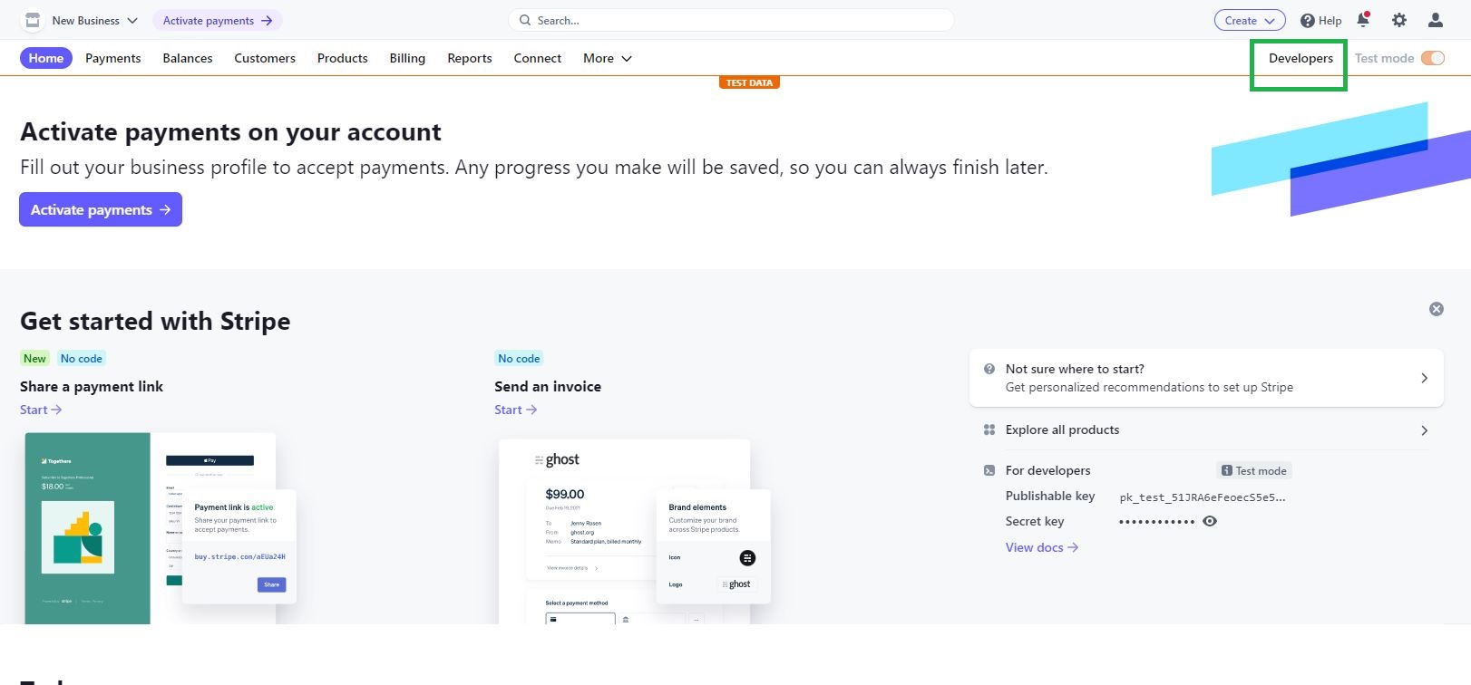 We will be needing a Stripe publishable key and secret key in order to configure the stripe payment gateway.