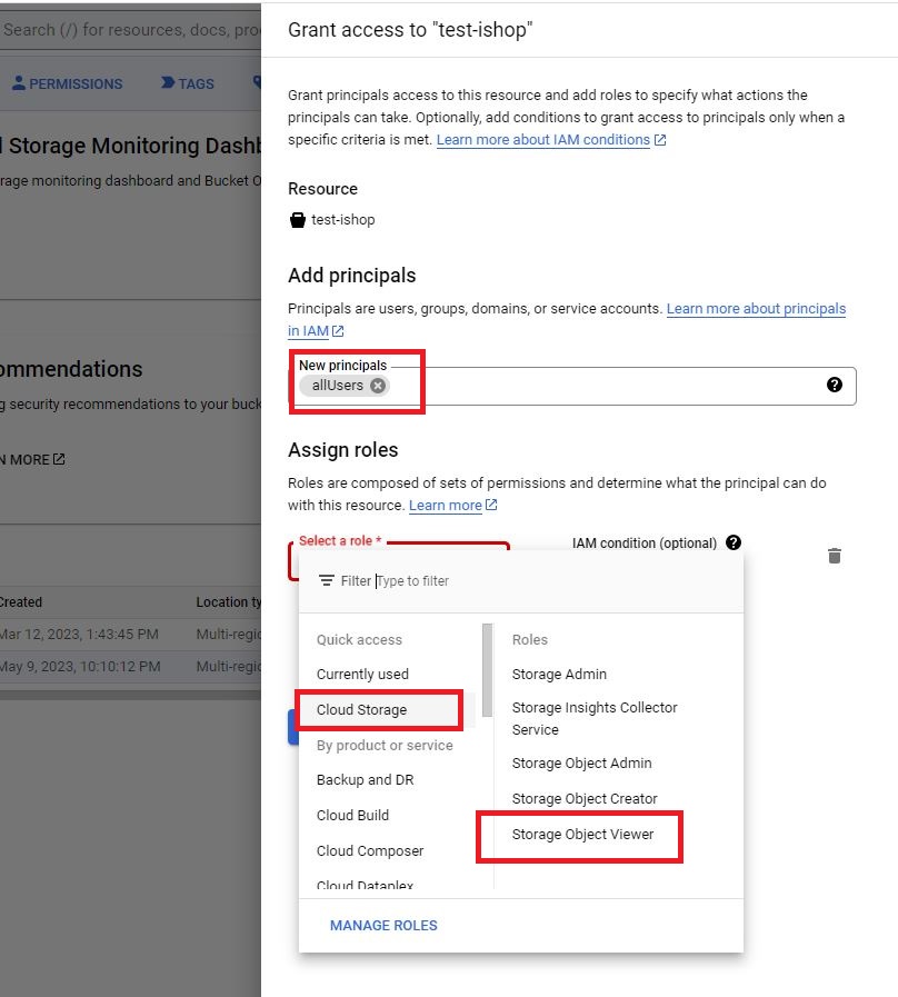 - In the select a role section, select Cloud Storage > Storage Object viewer.