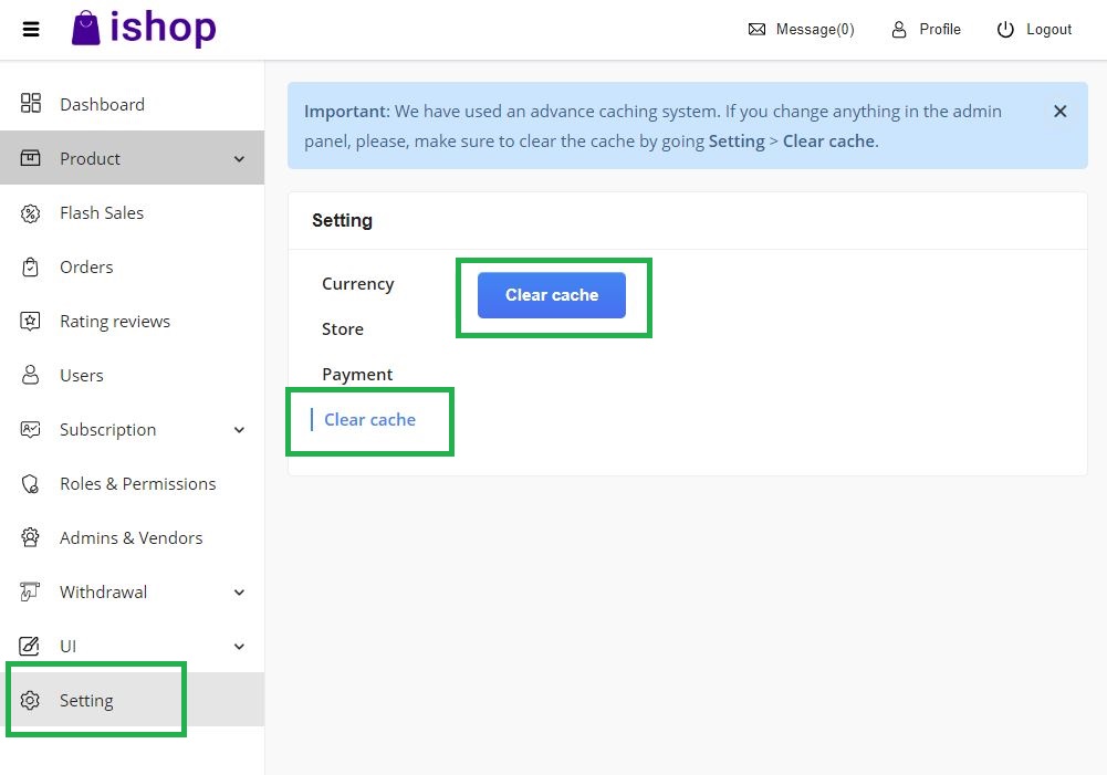 - Open admin.yourdomain.com/api/clear-cache in the browser. Cache has been cleared.