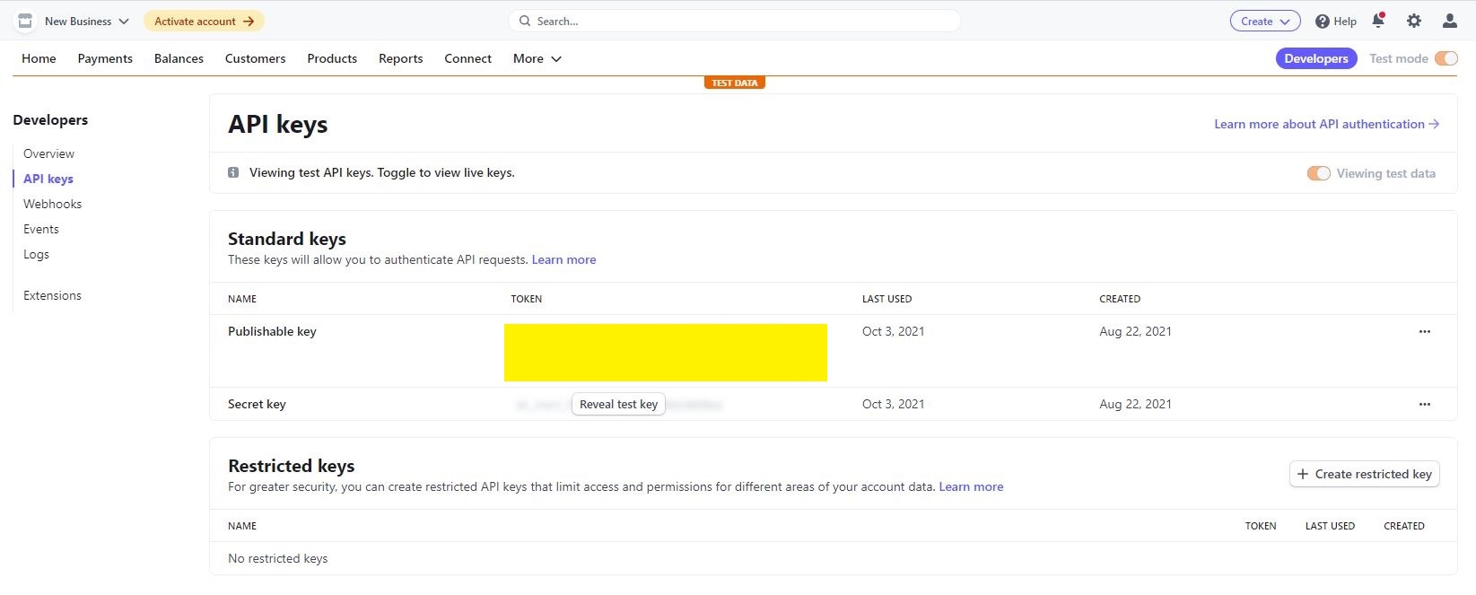We will be needing a Stripe publishable key and secret key in order to configure the stripe payment gateway.